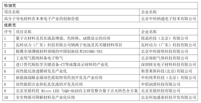決賽評(píng)審團(tuán)由具備深厚行業(yè)背景與實(shí)踐經(jīng)驗(yàn)的專家組成,從技術(shù)可行性、市場(chǎng)前景、商業(yè)模式等多維度,對(duì)參賽項(xiàng)目進(jìn)行了專業(yè)點(diǎn)評(píng)與指導(dǎo)。經(jīng)過(guò)激烈角逐,高分子導(dǎo)電材料在未來(lái)電子產(chǎn)業(yè)的創(chuàng)新價(jià)值項(xiàng)目獲得了本次大賽的特別獎(jiǎng),量子點(diǎn)材料及其在液晶增強(qiáng)、色轉(zhuǎn)換、AR微顯示的應(yīng)用等10個(gè)項(xiàng)目獲得優(yōu)勝獎(jiǎng)。