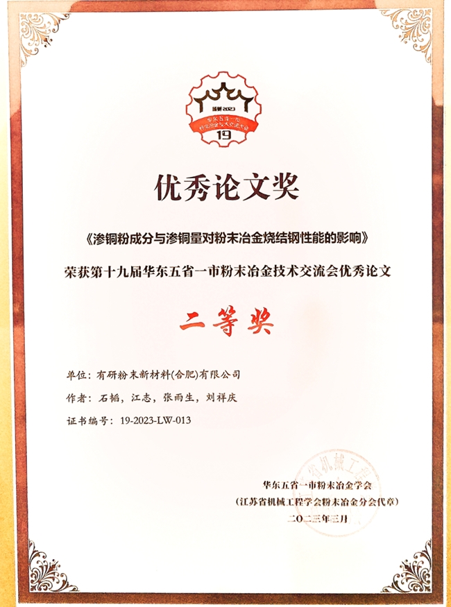 參會論文《滲銅粉成分與滲銅量對粉末冶金燒結鋼性能的影響》被評為交流會優(yōu)秀論文二等獎。