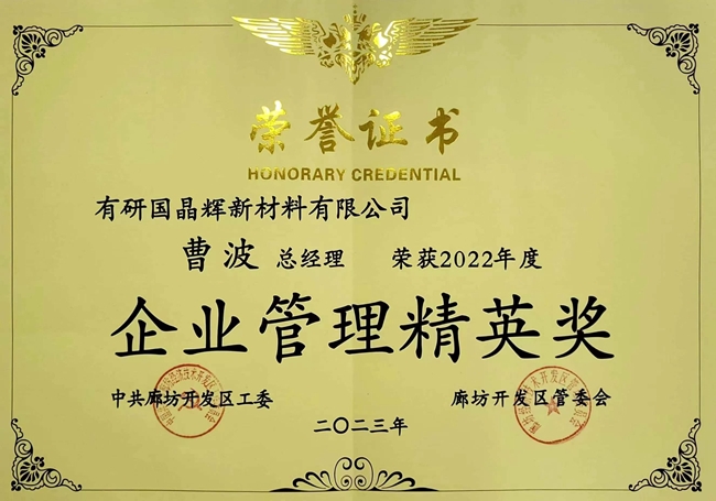 為表彰先進(jìn)、樹立典型,大力弘揚(yáng)企業(yè)家精神,激勵(lì)廣大干部職工踔厲奮發(fā)、勇毅前行,不斷開創(chuàng)各項(xiàng)事業(yè)發(fā)展新局面,經(jīng)廊坊開發(fā)區(qū)黨工委研究決定,對(duì)2022年度高質(zhì)量發(fā)展優(yōu)秀企業(yè)予以表彰,其中有研國(guó)晶輝公司被授予“優(yōu)秀貢獻(xiàn)獎(jiǎng)”和“河北省科學(xué)技術(shù)獎(jiǎng)”,并給予30萬(wàn)元獎(jiǎng)勵(lì)。公司總經(jīng)理曹波同志榮獲2022年度企業(yè)管理精英獎(jiǎng)。