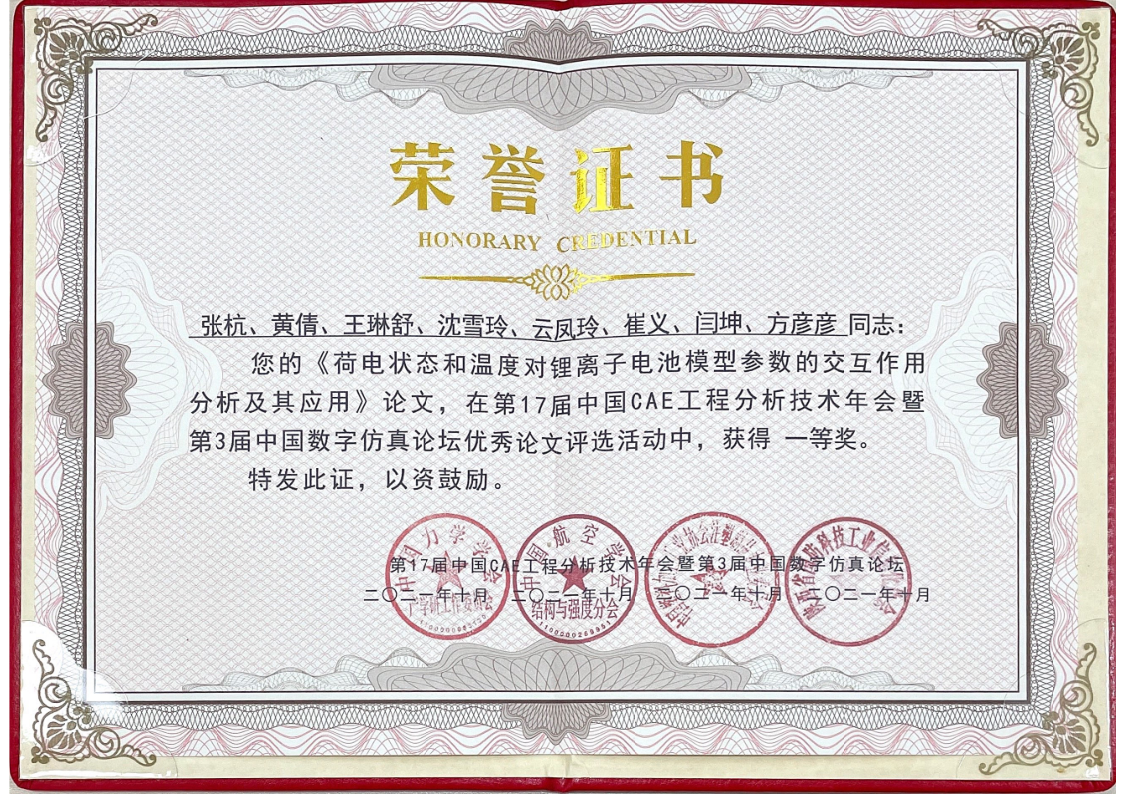 近日,國聯(lián)研究院榮獲第17屆中國CAE工程技術(shù)年會暨第三屆數(shù)字仿真論壇論文一等獎,論文題目是《荷電狀態(tài)和溫度對鋰離子電池模型參數(shù)的交互作用分析及應(yīng)用》。