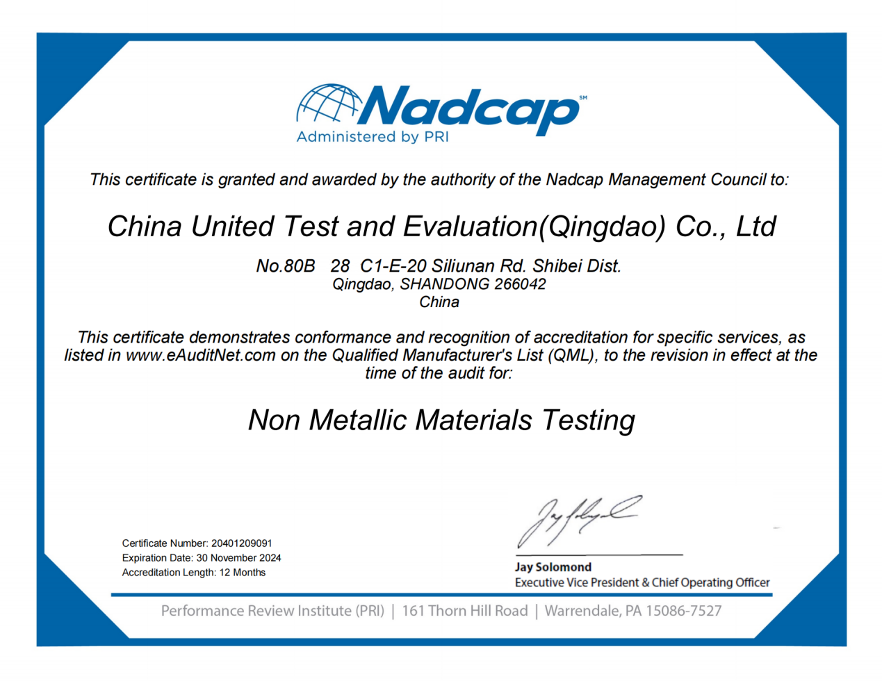 經(jīng)過多年籌劃和精心準(zhǔn)備,國(guó)合通用(青島)測(cè)試評(píng)價(jià)有限公司近期通過了NADCAP NMMT(非金屬材料)檢測(cè)實(shí)驗(yàn)室認(rèn)證。加上2020年7月通過的NADCAP MTL(金屬材料)檢測(cè)實(shí)驗(yàn)室認(rèn)證,國(guó)合青島成為全國(guó)同時(shí)通過NADCAP 金屬材料和非金屬材料檢測(cè)實(shí)驗(yàn)室認(rèn)證的五家實(shí)驗(yàn)室之一。