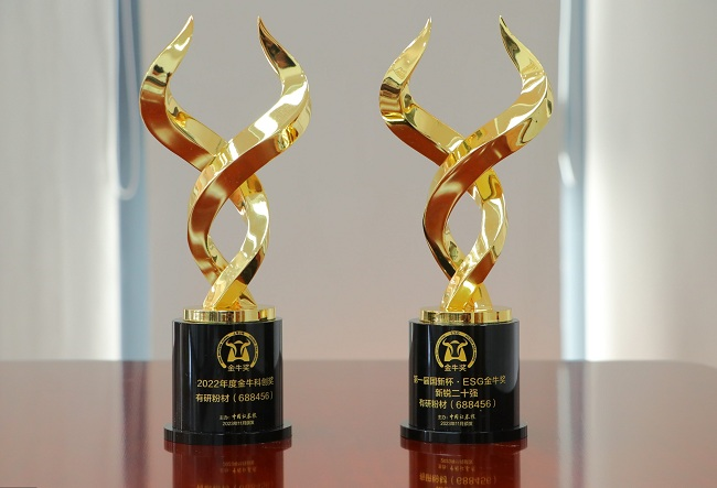 11月23日至24日,由中國(guó)證券報(bào)、南通市人民政府主辦的2023上市公司高質(zhì)量發(fā)展論壇暨第二十五屆上市公司金牛獎(jiǎng)?lì)C獎(jiǎng)典禮,由中國(guó)證券報(bào)、中國(guó)國(guó)新控股有限責(zé)任公司、南通市人民政府主辦的2023金牛企業(yè)可持續(xù)發(fā)展論壇暨第一屆國(guó)新杯·ESG金牛獎(jiǎng)?lì)C獎(jiǎng)典禮在江蘇南通舉行。有研粉材憑借優(yōu)異的科技創(chuàng)新和金屬粉體制備領(lǐng)域技術(shù)優(yōu)勢(shì)等突出表現(xiàn),榮獲“2022年度金??苿?chuàng)獎(jiǎng)”和“第一屆國(guó)新杯·ESG金牛獎(jiǎng)新銳二十強(qiáng)”。