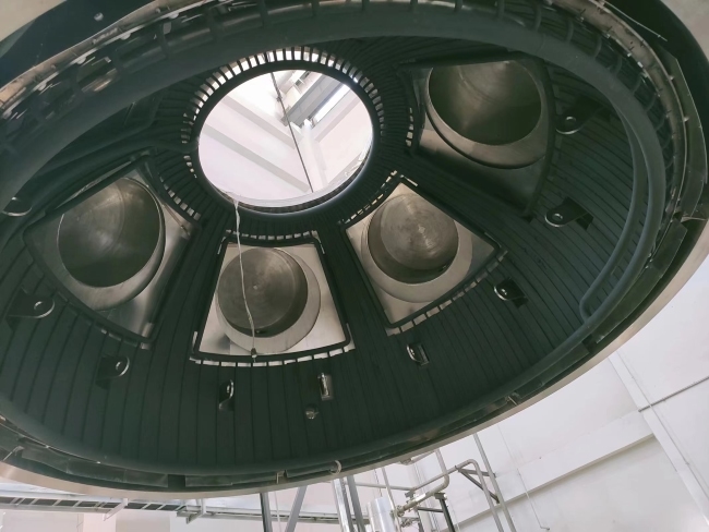 該裝置熱沉系統(tǒng)具有體積龐大、結(jié)構(gòu)復(fù)雜,技術(shù)要求高的特點。為了模擬宇宙冷黑環(huán)境,一般要求系統(tǒng)真空度達到10-3Pa,溫度誤差1%以內(nèi),這對熱沉的加工精度、涂層均勻性、焊接質(zhì)量等提出了極大挑戰(zhàn)。熱沉頂部采用了半球形設(shè)計,與常規(guī)筒狀熱沉相比,保證頂部精確成型是項目的攻關(guān)難點。有研工研院的工藝技術(shù)人員經(jīng)過多次研究、反復(fù)試驗、連續(xù)奮戰(zhàn),創(chuàng)新開發(fā)出多種工裝及加工工藝,順利完成了高精度球冠熱沉制造。熱沉裝入模擬裝置后,檢漏和全方位焊接難度極大,對焊縫質(zhì)量提出了極高的要求。有研工研院針對鋁合金高質(zhì)量焊接工藝積極開展攻關(guān),突破了熱沉高質(zhì)量焊接關(guān)鍵技術(shù),確保高標準完成任務(wù)。