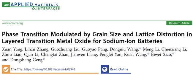 此外,團隊針對O3型材料的相變與循環(huán)穩(wěn)定性的構(gòu)效關系,在《ACS Applied Materials & Interfaces》上發(fā)表了題為“Phase Transition Modulated by Grain Size and Lattice Distortion in Layered Transition Metal Oxide for Sodium-Ion Batteries”(影響因子9.5)的成果。該研究指出,O3型層狀正極材料脫鈉過程中產(chǎn)生的滑移是引起劇烈體積變化以及材料顆粒裂紋的主要原因,通過控制更小的晶粒尺寸及扭曲程度更大的過渡金屬-氧八面體可以有效降低滑移的剪切應力,從而提升材料的循環(huán)壽命。