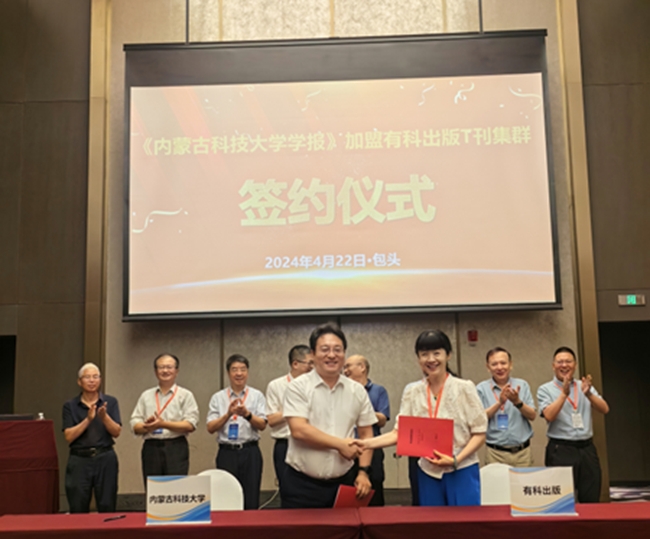 會(huì)上還舉行了《內(nèi)蒙古科技大學(xué)學(xué)報(bào)》加盟有科出版工程技術(shù)期刊集群(T刊集群)簽約儀式。內(nèi)蒙古科技大學(xué)副校長(zhǎng)張新房與錢九紅代表雙方簽署協(xié)議。中國(guó)科學(xué)院院士蔣成保,中國(guó)稀土學(xué)會(huì)理事長(zhǎng)李波,中國(guó)鋼研科技集團(tuán)有限公司黨委常委、副總經(jīng)理趙棟梁,天津工業(yè)大學(xué)校長(zhǎng)姜勇,包頭稀土研究院院長(zhǎng)嚴(yán)密,安徽大學(xué)副校長(zhǎng)王守國(guó),北京科技大學(xué)教授于廣華,內(nèi)蒙古科技大學(xué)學(xué)報(bào)編輯部相關(guān)負(fù)責(zé)人共同見(jiàn)證。本次簽約是內(nèi)蒙古自治區(qū)高校學(xué)報(bào)加盟期刊集群的首次嘗試,是出版企業(yè)與高校在科技期刊領(lǐng)域深度融合的重要實(shí)踐。雙方將在整合共享優(yōu)質(zhì)學(xué)術(shù)出版資源、構(gòu)建高端學(xué)術(shù)交流平臺(tái)等方面共同發(fā)力,以實(shí)際行動(dòng)踐行“把論文寫在祖國(guó)的大地上”。