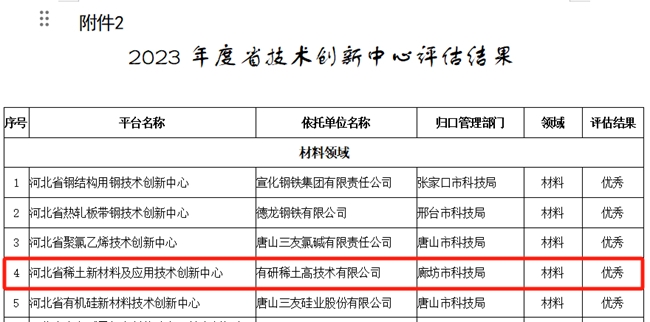日前,河北省科技廳發(fā)布了《關于公布2023年度省重點實驗室、技術創(chuàng)新中心績效評估與驗收工作結果的通知》,依托有研稀土公司建設的“河北省稀土新材料及應用技術創(chuàng)新中心”(以下簡稱中心)在2023年度績效評估中被評為“優(yōu)秀”。