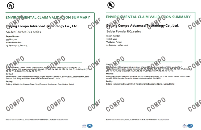 近日,康普錫威Solder Powder RC1 Series(Sn-Ag-Cu錫焊粉系列)和Solder Powder RC2 Series(Sn-Bi-Ag錫焊粉系列)產(chǎn)品通過全球知名認證公司UL Solutions嚴格的資料及生產(chǎn)現(xiàn)場審核,喜獲UL 2809標準的再生含量驗證證書。此證書也是國內錫焊粉行業(yè)首張UL 2809驗證證書。