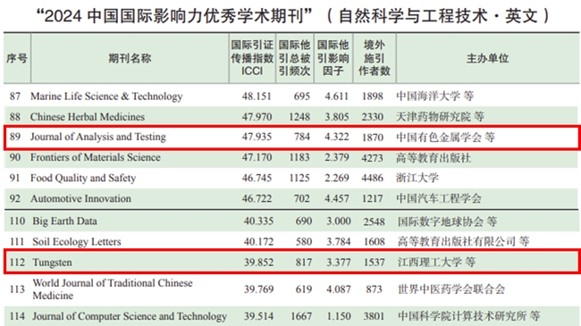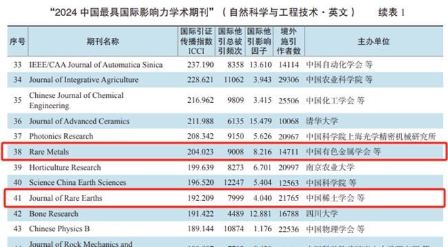 12月24日,《中國學(xué)術(shù)期刊國際引證年報(2024版)》重磅發(fā)布,有科出版旗下4本英文期刊再次入選中國國際影響力學(xué)術(shù)期刊榜單。其中,Rare Metals(《稀有金屬(英文)》)、Journal of Rare Earths(《稀土學(xué)報(英文)》連續(xù)13年入選“中國最具國際影響力學(xué)術(shù)期刊”;Journal of Analysis and Testing(《分析檢測(英文)》)、Tungsten(《鎢科技(英文)》)連續(xù)3年入選“中國國際影響力優(yōu)秀學(xué)術(shù)期刊”。