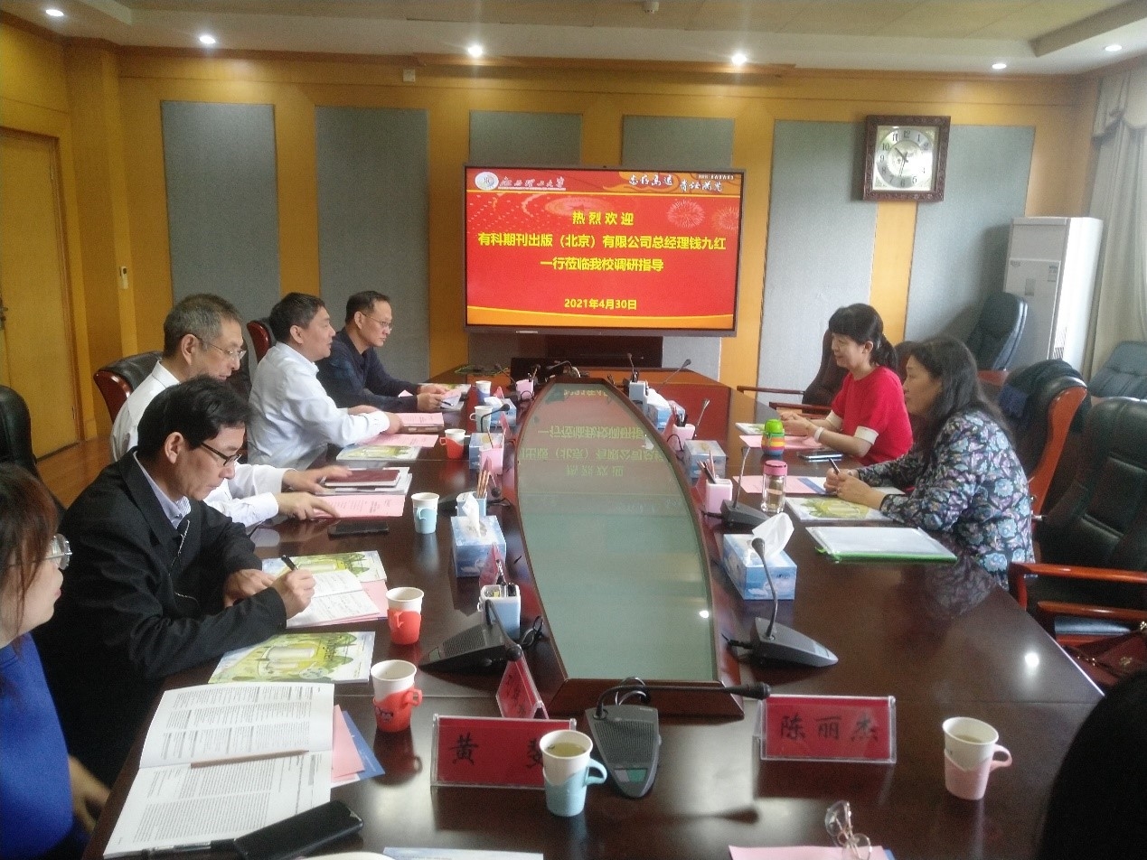 2021年4月30日,有科出版總經(jīng)理錢九紅一行赴江西理工大學期刊社就有色期刊集群化建設(shè)及校企合作辦刊等事項進行深入商談與交流。江西理工大學副校長羅仙平、期刊社社長黃志紅、副社長曾偉明及期刊社各編輯部負責人出席。會議由羅仙平主持。會前,江西理工大學黨委書記、《鎢科技(英文)》主編楊斌教授會見錢九紅一行。