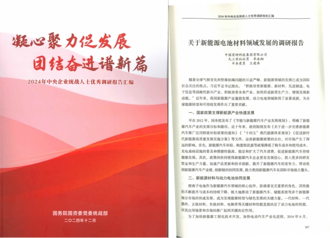 日前,國(guó)務(wù)院國(guó)資委黨委統(tǒng)戰(zhàn)部發(fā)布《2024年度中央企業(yè)統(tǒng)戰(zhàn)人士?jī)?yōu)秀調(diào)研報(bào)告匯編》,國(guó)聯(lián)研究院九三學(xué)社社員卓浩翔、中共黨員王建濤聯(lián)合撰寫(xiě)的調(diào)研報(bào)告《關(guān)于新能源電池材料領(lǐng)域發(fā)展的調(diào)研報(bào)告》入選匯編。