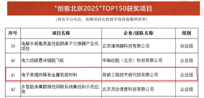 近日,在第十屆“創(chuàng)客中國”北京市中小企業(yè)創(chuàng)新創(chuàng)業(yè)大賽暨“創(chuàng)客北京2025”創(chuàng)新創(chuàng)業(yè)大賽中,有研工研院特種加工技術(shù)與裝備事業(yè)部研發(fā)團隊申報的“電子束提純稀有金屬釩鉬材料”項目,歷經(jīng)初賽、復(fù)賽、決賽多輪激烈角逐,從全市6098個參賽項目中脫穎而出,成功躋身大賽TOP150榜單。