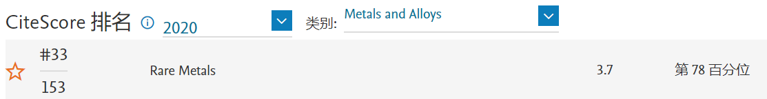 《稀有金屬(英文版)》(Rare Metals)CiteScore 2020:3.7,較2019年度(2.9)提升27.6%,位于Metals and Alloys學(xué)科Q1區(qū)(33/153),較2019年度(38/152)提升5名。