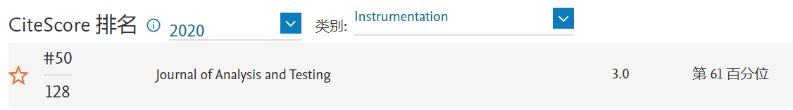 《分析檢測(cè)(英文)》(Journal of Analysis and Testing) CiteScore 2020:3.0,較2019年度(1.8)提升66.7%,位于Instrumentation學(xué)科Q2區(qū)(50/128),較2019年度(84/129)提升34名。