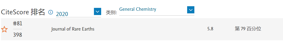 《稀土學(xué)報(bào)(英文版)》(Journal of Rare Earths)CiteScore 2020:5.8,較2019年度(5.0)提升16%,位于General Chemistry學(xué)科Q1區(qū)(81/398),較2019年度(90/398)提升9名。