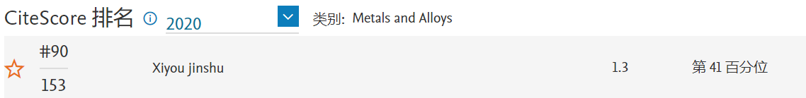 《稀有金屬》 CiteScore 2020:1.3,較2019年度(1.0)提升30%,位于Metals and Alloys學(xué)科Q3區(qū)(90/153),較2019年度(93/152)提升3名。