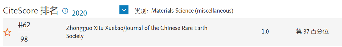《中國(guó)稀土學(xué)報(bào)》 CiteScore 2020:1.0,位于Materials Science (miscellaneous)學(xué)科Q3區(qū)(62/98)。