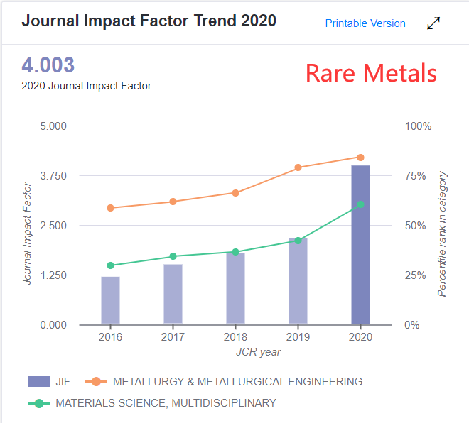 《稀有金屬(英文版)》2020年度影響因子達(dá)4.003,較上一年度(2.161)增長(zhǎng)85%,連續(xù)5年刷新歷史新高;在JCR冶金工程學(xué)科(Metallurgy& Metallurgical Engineering)中排名13/80,繼續(xù)保持Q1區(qū),與上年度(17/79)相比提升4位;總被引頻次3520次,較上一年度(2209次)增長(zhǎng)59%?!断∮薪饘伲ㄓ⑽陌妫芬殉蔀橛猩饘倨诳簢?guó)際影響力最高的期刊。