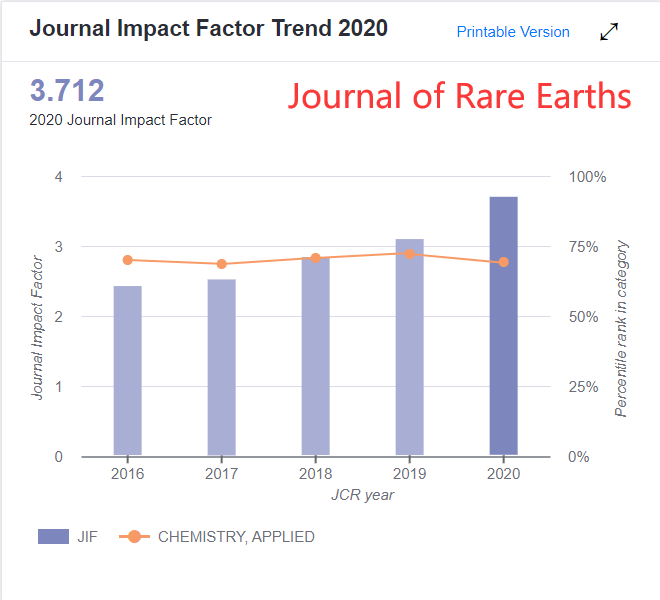 《稀土學(xué)報(bào)(英文版)》2020年度影響因子3.712,較上一年度(3.104)增長(zhǎng)20%,連續(xù)6年刷新歷史新高;在JCR應(yīng)用化學(xué)學(xué)科(Chemistry, Applied)中排名23/74(2019年度排名20/71),繼續(xù)保持Q2區(qū);總被引頻次6419次,較上一年度(5310次)增長(zhǎng)21%。