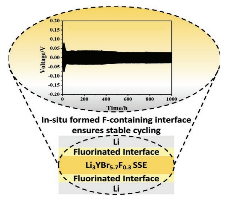 該技術(shù)科技成果是在有研集團(tuán)科技創(chuàng)新基金的支持下,由國(guó)聯(lián)研究院聯(lián)合有研稀土、有研工研院以及加拿大聯(lián)合實(shí)驗(yàn)室等內(nèi)外部創(chuàng)新資源開展項(xiàng)目攻關(guān)共同完成的。創(chuàng)新團(tuán)隊(duì)以Li3YBr6(LYB)鹵化物固態(tài)電解質(zhì)為基體進(jìn)行F摻雜,制備研發(fā)出Li3YBr5.7F0.3固態(tài)電解質(zhì)材料,該固態(tài)電解質(zhì)材料通過(guò)與金屬鋰原位生成高濃度氟化物界面鈍化層,顯著提升了鋰金屬負(fù)極在全固態(tài)電池應(yīng)用的循環(huán)穩(wěn)定性,解決了鹵化物固態(tài)電解質(zhì)材料應(yīng)用于金屬鋰負(fù)極固態(tài)電池的關(guān)鍵技術(shù)瓶頸,為推動(dòng)新能源動(dòng)力電池行業(yè)發(fā)展高比能量全固態(tài)電池提供了新思路。
