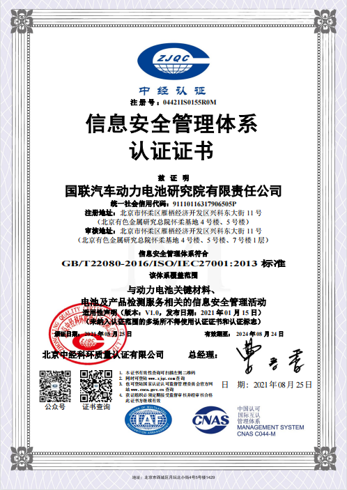 8月25日,國聯(lián)研究院獲得了由北京中經(jīng)科環(huán)質(zhì)量認證有限公司頒發(fā)的信息安全管理體系證書,認證范圍包括與動力電池關(guān)鍵材料、電池及產(chǎn)品檢測服務(wù)相關(guān)的信息安全管理活動。