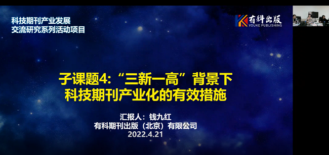 4月21日,有科出版順利入選“‘學(xué)清刊壇’(第二期)—科技期刊產(chǎn)業(yè)發(fā)展交流研究系列活動(dòng)”項(xiàng)目。由中國科協(xié)學(xué)會(huì)服務(wù)中心主辦,同方知網(wǎng)(北京)技術(shù)有限公司承辦的“‘學(xué)清刊壇’(第二期)—科技期刊產(chǎn)業(yè)發(fā)展交流研究系列活動(dòng)”項(xiàng)目顧問委員會(huì)第一次會(huì)議在線上召開。董爾丹院士、黃小衛(wèi)院士、劉文清院士、中國有色金屬學(xué)會(huì)理事長(zhǎng)賈明星及業(yè)內(nèi)專家學(xué)者共計(jì)59人參會(huì)。有科出版承擔(dān)了“學(xué)清刊壇(第一期)”子課題“中國科技期刊產(chǎn)業(yè)化發(fā)展戰(zhàn)略研討”并圓滿完成了相關(guān)活動(dòng),“學(xué)清刊壇(第二期)”子課題“三新一高”背景下科技期刊產(chǎn)業(yè)化的有效措施的研究”再次由有科出版承擔(dān),董事長(zhǎng)、總經(jīng)理錢九紅出席并匯報(bào)今年的工作計(jì)劃和進(jìn)度情況。
