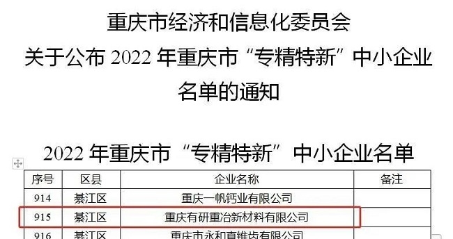 6月1日,重慶市經(jīng)信委公布2022年重慶市“專精特新”中小企業(yè)名單,有研重冶名列其中。