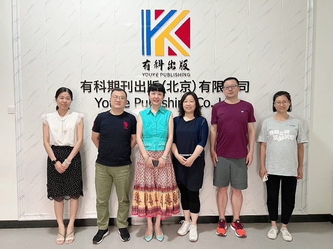 7月14日,德古意特出版社中國(guó)區(qū)編輯總監(jiān)、亞太區(qū)出版合作伙伴關(guān)系總監(jiān)丁海珈,《北京大學(xué)學(xué)報(bào)(醫(yī)學(xué)版)》編審任延剛,華先同勝(北京)數(shù)字科技有限公司總經(jīng)理張海寧到有科出版開(kāi)展業(yè)務(wù)交流,有科出版董事長(zhǎng)、總經(jīng)理錢九紅,副總經(jīng)理馬雯及數(shù)字出版部相關(guān)同志陪同。