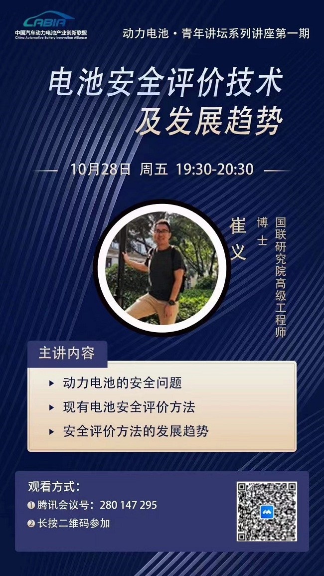 10月28日,國(guó)聯(lián)研究院組織開展“動(dòng)力電池•青年講壇”第一期專題講座,國(guó)聯(lián)研究院檢測(cè)事業(yè)部系統(tǒng)及安全可靠檢測(cè)中心經(jīng)理崔義博士以線上直播的方式作報(bào)告,分享交流動(dòng)力電池安全評(píng)價(jià)技術(shù)及發(fā)展趨勢(shì)。本期講座有來自企業(yè)、行業(yè)機(jī)構(gòu)、科研院所等專業(yè)人士300余人線上參與講座直播,交流探討安全有關(guān)技術(shù)問題及評(píng)價(jià)方法,達(dá)成了互促共進(jìn)、共同提升的效果,為動(dòng)力電池安全評(píng)價(jià)與性能改善提供思路。