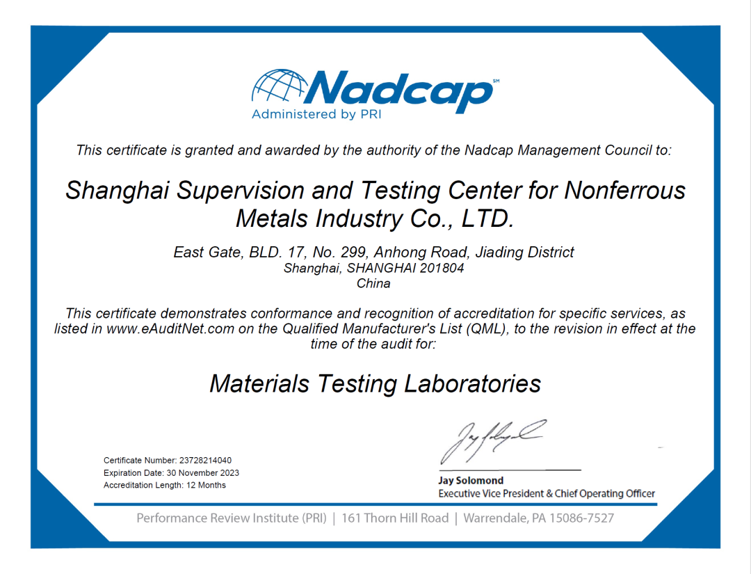 上海有色金屬工業(yè)技術(shù)監(jiān)測(cè)中心有限公司于2022年12月6日順利通過(guò)美國(guó)質(zhì)量工程協(xié)會(huì)(PRI,Performance Review Institute)組織的Nadcap認(rèn)證審核,并獲得Nadcap-MTL(材料測(cè)試實(shí)驗(yàn)室)認(rèn)證資質(zhì)證書(shū)。