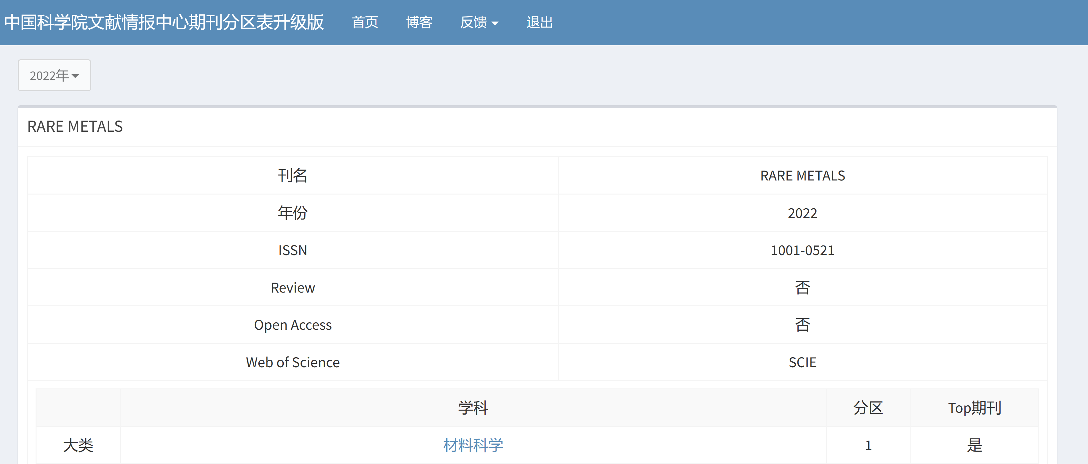 12月21日,《2022年中國科學院文獻情報中心期刊分區(qū)表》正式發(fā)布。《稀有金屬(英文版)》(Rare Metals)進入2022年中科院期刊分區(qū)表材料科學1區(qū)TOP期刊行列。材料科學類共有410本期刊,其中進入中科院期刊分區(qū)1區(qū)的有58本。