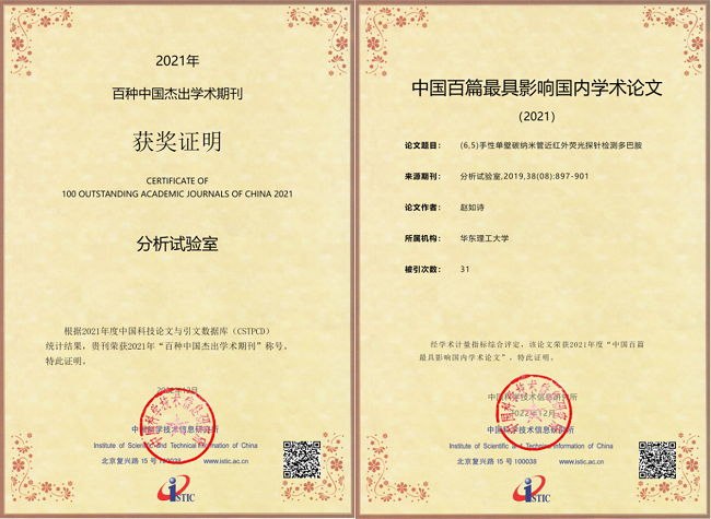 2022年12月29日,中國科學(xué)技術(shù)信息研究所發(fā)布了2021年度中國科技論文統(tǒng)計(jì)結(jié)果,《分析試驗(yàn)室》蟬聯(lián)四屆“百種中國杰出學(xué)術(shù)期刊”榮譽(yù)稱號(共獲5次),綜合評價(jià)總分在冶金工程學(xué)科排名第一;所刊發(fā)論文《(6,5)手性單壁碳納米管近紅外熒光探針檢測多巴胺》入選“中國百篇最具影響國內(nèi)學(xué)術(shù)論文”?!斗治鲈囼?yàn)室》繼2021年被美國工程索引(EI)收錄之后再創(chuàng)佳績。