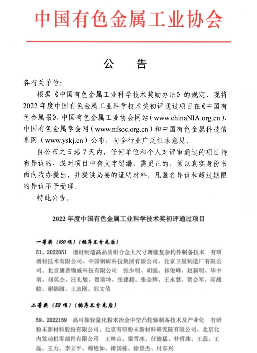 本次獲得“中國有色金屬工業(yè)科學技術獎”,不但展示出有研粉材在行業(yè)內的技術領先優(yōu)勢,同時對提高公司在金屬粉體材料領域的影響力和知名度、推動行業(yè)技術進步、培養(yǎng)創(chuàng)新人才等方面具有重要作用。