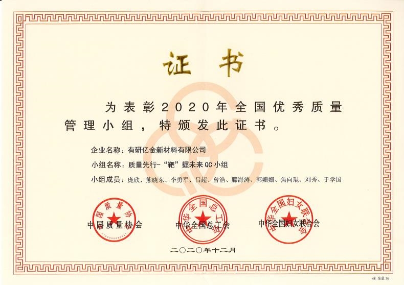 近日,從中國(guó)質(zhì)量協(xié)會(huì)年會(huì)上傳來(lái)喜訊,有研集團(tuán)三級(jí)子公司有研億金質(zhì)量先行—“靶”握未來(lái)QC(質(zhì)量控制)小組被中國(guó)質(zhì)量協(xié)會(huì)、中華全國(guó)總工會(huì)、中華全國(guó)婦女聯(lián)合會(huì)聯(lián)合授予“2020年全國(guó)優(yōu)秀質(zhì)量管理小組”稱號(hào)。