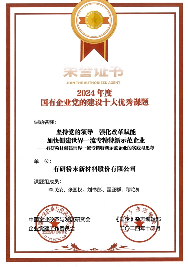 12月6日,在珠海舉辦的(第三屆)國有企業(yè)黨的建設(shè)論壇上,有研粉材黨建成果《堅(jiān)持黨的領(lǐng)導(dǎo)、強(qiáng)化改革賦能,加快建設(shè)世界一流專精特新示范企業(yè)——有研粉材創(chuàng)建世界一流專精特新示范企業(yè)的實(shí)踐與思考》,被評(píng)為“2024年度國有企業(yè)黨的建設(shè)十大優(yōu)秀課題”。