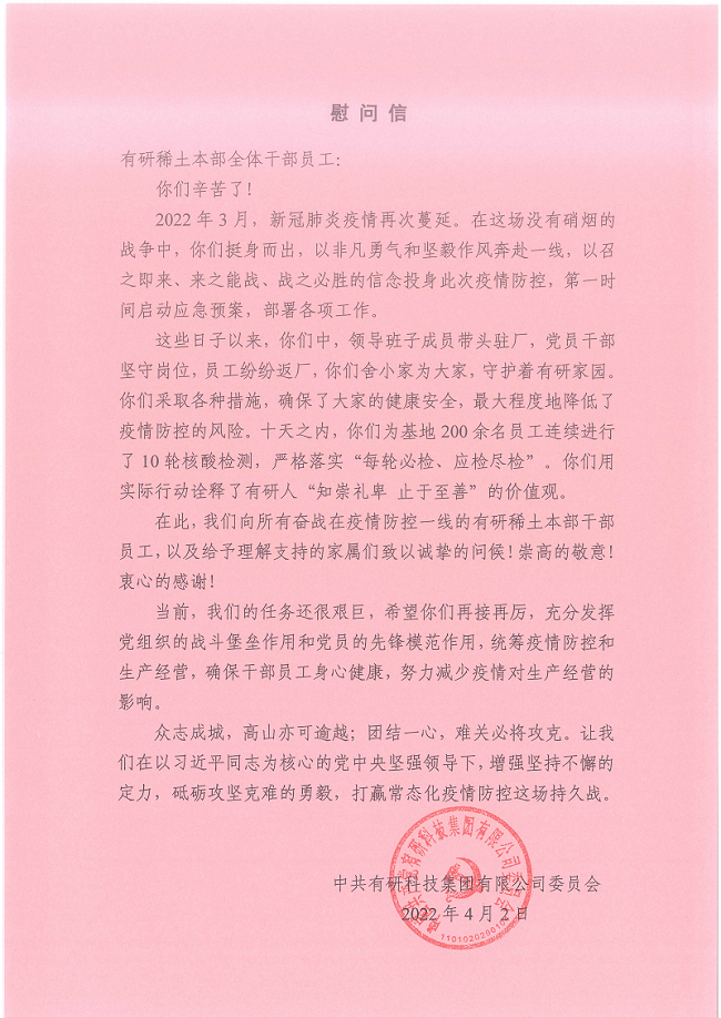 4月2日,有研集團(tuán)黨委分別給有研稀土本部、青島公司、榮成公司發(fā)來慰問信,對(duì)公司統(tǒng)籌做好疫情防控和生產(chǎn)經(jīng)營(yíng)的成績(jī)表示肯定,對(duì)堅(jiān)守陣地、堅(jiān)持生產(chǎn)的人員表示慰問。“在這場(chǎng)沒有硝煙的戰(zhàn)爭(zhēng)中,你們挺身而出,以非凡勇氣和堅(jiān)毅作風(fēng)奔赴一線,以召之即來、來之能戰(zhàn)、戰(zhàn)之必勝的信念投身這次疫情防控”,“領(lǐng)導(dǎo)干部帶頭駐廠,黨員干部堅(jiān)守崗位,員工紛紛返廠,你們舍小家為大家,守護(hù)著我們的有研家園…… 你們用實(shí)際行動(dòng)詮釋了有研人‘知崇禮卑 止于至善’的價(jià)值觀”,這些滾燙的話語(yǔ)溫暖著每一位有研稀土人,也鼓舞我們繼續(xù)努力奮斗。