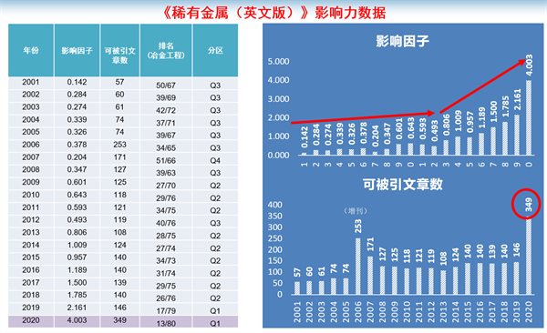 博觀約取,厚積薄發(fā)。2001年,期刊被美國《科學(xué)引文索引》SCIE收錄,其后期刊影響因子和影響力穩(wěn)步提高,特別是近十年,影響因子呈飛躍式攀升:從0.493穩(wěn)步提升至4.003,增長8倍,發(fā)文量從119篇增加到349篇;2019年首次進(jìn)入國際冶金工程類Q1區(qū),成為中國81本Q1區(qū)期刊之一;2020年度影響因子在中國大陸265本SCI收錄期刊中排第96位、冶金工程領(lǐng)域中國大陸11種期刊中排第3位;2020年度發(fā)文量在中國大陸265本SCI收錄期刊中排第16位、冶金工程領(lǐng)域中國大陸11種期刊中排第3位。期刊影響因子和發(fā)文量實(shí)現(xiàn)雙增長,是一流科技期刊一流學(xué)術(shù)平臺(tái)初期探索與實(shí)踐的成功案例。此外,《稀有金屬(英文版)》獲得多項(xiàng)行業(yè)獎(jiǎng)項(xiàng),入選中國科技期刊卓越行動(dòng)計(jì)劃,獲評(píng)國家新聞出版局首屆全國百強(qiáng)報(bào)刊、中國科協(xié)優(yōu)秀國際科技期刊獎(jiǎng)、中國最具國際影響力學(xué)術(shù)期刊(連續(xù)9年)、“有色金屬領(lǐng)域科技期刊高質(zhì)量分級(jí)目錄”T1級(jí)別期刊、中國有色金屬出版物獎(jiǎng)(連續(xù)4次)、中國科協(xié)主管科技期刊審讀優(yōu)級(jí)期刊等。