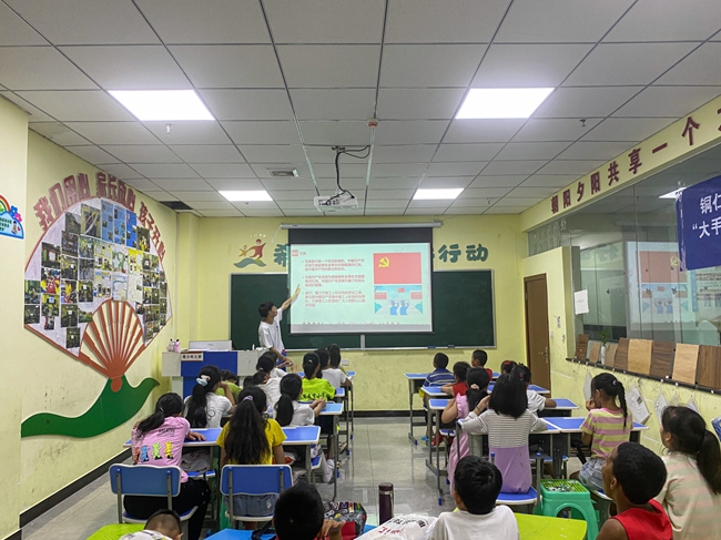 2021年,在建黨一百周年之際,研究生支教團(tuán)的志愿者們緊隨學(xué)黨史的熱潮,圍繞“學(xué)黨史、感黨恩、跟黨走”這一主題,給社區(qū)的孩子們開(kāi)展了黨史學(xué)習(xí)教育,包括專(zhuān)題思政課、慶祝建黨一百周年繪畫(huà)課、《我和我的祖國(guó)》觀影活動(dòng)。思政課上研究生支教團(tuán)與同學(xué)們一同回顧了慶祝中國(guó)共產(chǎn)黨成立100周年大會(huì),認(rèn)真學(xué)習(xí)了習(xí)近平總書(shū)記重要講話(huà)、共青團(tuán)員與少先隊(duì)員代表致辭,習(xí)近平總書(shū)記的講話(huà)讓大家感受到由衷的自豪感,也讓孩子們暗暗許下了“請(qǐng)黨放心,強(qiáng)國(guó)有我”的誓言。隨后進(jìn)行了先進(jìn)人物事跡的講述,讓孩子們感受共產(chǎn)黨員全心全意為人民服務(wù)的高貴品格,引導(dǎo)他們從小樹(shù)立報(bào)效祖國(guó)服務(wù)社會(huì)的崇高理想信念。最后帶領(lǐng)他們學(xué)習(xí)黨旗、黨徽、國(guó)旗的組成元素與含義,了解五四青年節(jié)、七一建黨節(jié)、國(guó)慶節(jié)等,進(jìn)一步傳承和弘揚(yáng)中國(guó)共產(chǎn)黨優(yōu)秀的紅色文化,讓孩子們感受黨的光榮傳統(tǒng)中蘊(yùn)含的智慧與精神。