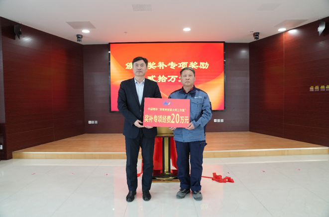 王興權為技能大師工作室頒發(fā)獎補專項獎勵。