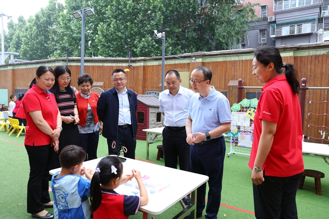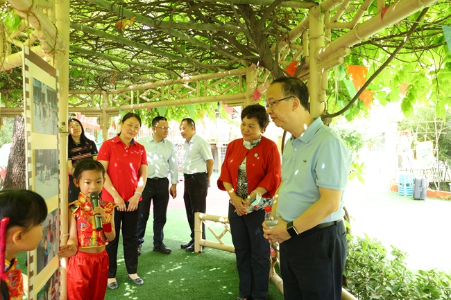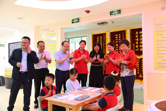 毛昌輝觀看了幼兒園豐富多彩的迎六一活動并聽取了活動介紹,肯定了教職員工付出的努力,并參與了水拓畫、筆墨童心等游戲項目。