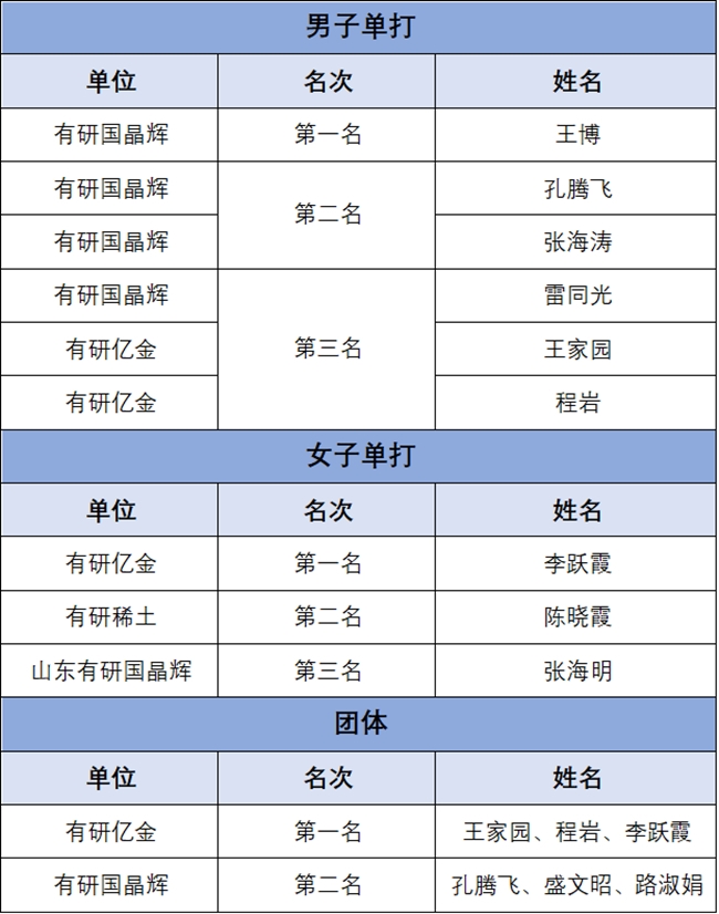 經(jīng)過激烈的比賽,各項冠軍紛紛出爐。有研億金憑借出色的團(tuán)隊協(xié)作和實力奪得了團(tuán)體賽桂冠,有研國晶輝王博和有研億金李躍霞分別獲得男子單打和女子單打冠軍。