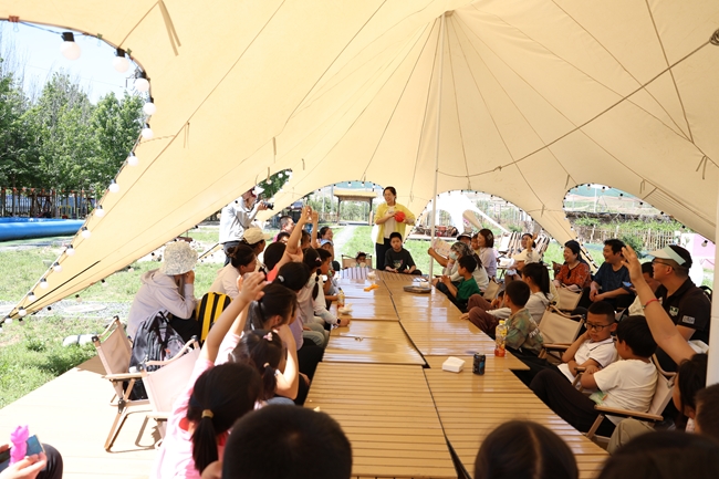 在基地的露營(yíng)野餐環(huán)節(jié),家長(zhǎng)和孩子們圍坐一起分享美食,交流著上午游玩的趣事,氛圍溫馨而融洽。午餐過(guò)后的擊鼓傳花互動(dòng)環(huán)節(jié)將活動(dòng)推向了另一個(gè)高潮。隨著鼓聲起落,“花”在孩子們手中歡樂(lè)傳遞,“幸運(yùn)”的大小朋友紛紛上臺(tái)表演節(jié)目,唱歌、跳舞、講故事…… 精彩的表演贏得陣陣掌聲,現(xiàn)場(chǎng)氣氛熱烈歡快。