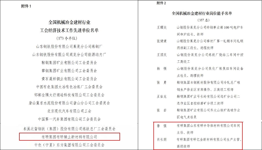 近日,中國(guó)機(jī)械冶金建材職工技術(shù)協(xié)會(huì)表彰了2022年全國(guó)機(jī)械冶金建材行業(yè)工會(huì)經(jīng)濟(jì)技術(shù)先進(jìn)單位和崗位能手。有研集團(tuán)有1家產(chǎn)業(yè)單位和2名產(chǎn)業(yè)工人獲此榮譽(yù)。