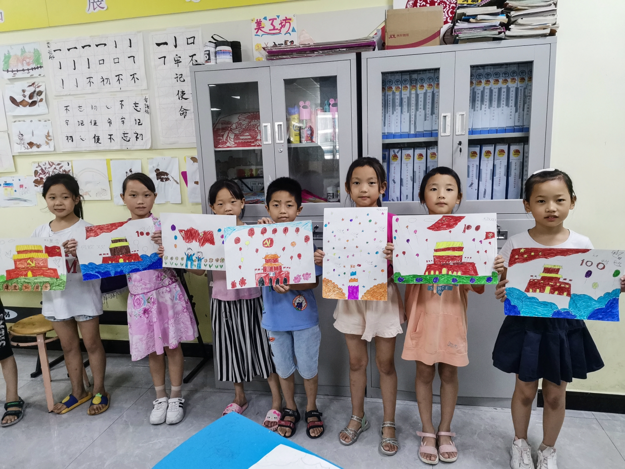 思政課最后,研究生支教團(tuán)給孩子們上了一節(jié)“感黨恩,跟黨走”主題繪畫課。孩子們有的用畫筆畫出了鮮紅的國旗、金色的黨徽和五角星,有的畫出了雄偉的天安門,還有的為黨的百年生日畫出了蛋糕……畫筆是孩子想象力的翅膀,也是孩子表達(dá)心愿的風(fēng)帆,這一幅幅畫正是他們?yōu)辄h的100歲生日獻(xiàn)上的真摯賀禮。