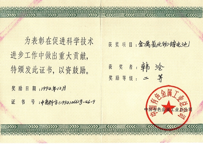 92年剛參加工作的小韓,一身干勁兒,肯下苦工,又愛琢磨,像一朵長(zhǎng)在產(chǎn)線上的蘑菇。這樣的狀態(tài)讓他第二個(gè)年頭就與項(xiàng)目組的同事們共同奮戰(zhàn)干成了一件大事兒——搞出了《金屬氫化物鎳電池》項(xiàng)目,受到中國(guó)有色金屬工業(yè)總公司頒發(fā)的二等科技進(jìn)步獎(jiǎng)的表彰。