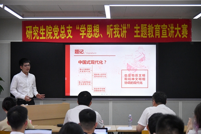 比賽環(huán)節(jié),10名宣講員依次上場,圍繞深入學(xué)習(xí)領(lǐng)會黨的二十大精神和習(xí)近平新時代中國特色社會主義思想,從政治、經(jīng)濟、文化、科技等角度分享心得體會,并結(jié)合生活實際,聯(lián)系自身感悟談理論、述政策、頌典型。碩士生李昊結(jié)合全國兩會闡發(fā)新時代中國式民主的內(nèi)涵,博士生朱學(xué)哲用數(shù)據(jù)說話展現(xiàn)新時代偉大變革,博士生唐文濤回顧中國動畫藝術(shù)發(fā)展史激發(fā)文化自信力量。